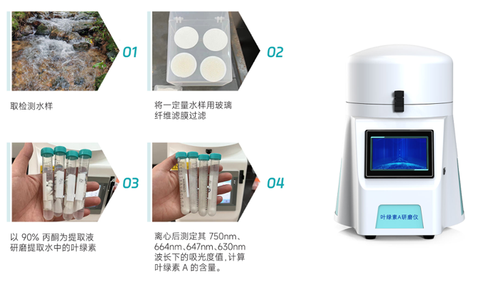 将一定量样品用滤膜过滤截留藻类,研磨破碎藻类细胞,用丙酮溶液提取叶绿素,离心分离后分别于750nm、664nm、647nm和630nm波长处测定提取液吸光度,根据公式计算水中叶绿素a的浓度。